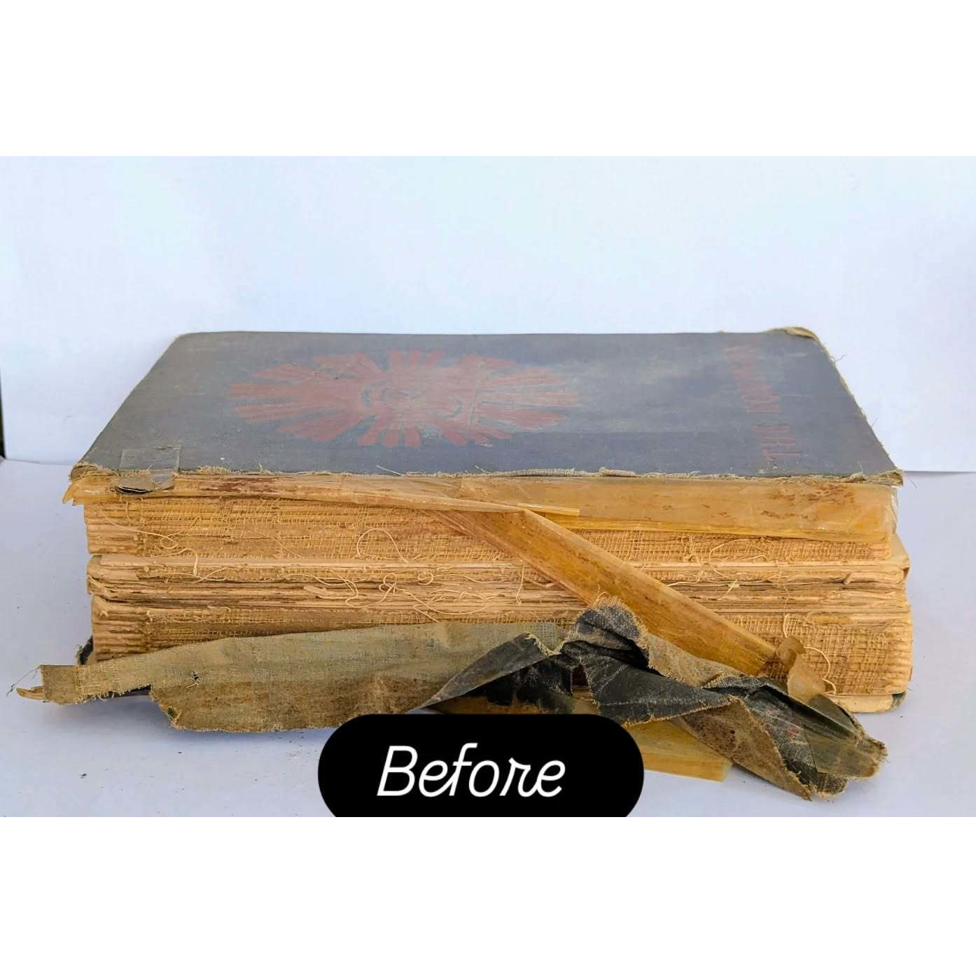 This book did not simply show its age; it had surrendered to it. The spine had long since failed, collapsing under the accumulated strain of time and handling. The text block had fractured into loose gatherings, their folds weakened, their edges softened and frayed. The covers, once protective, now hung apart like relics of a former structure.