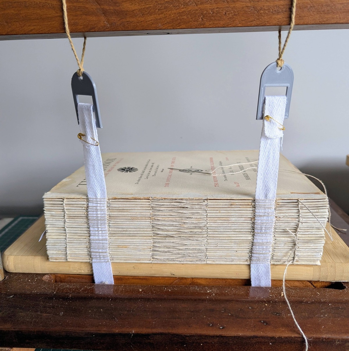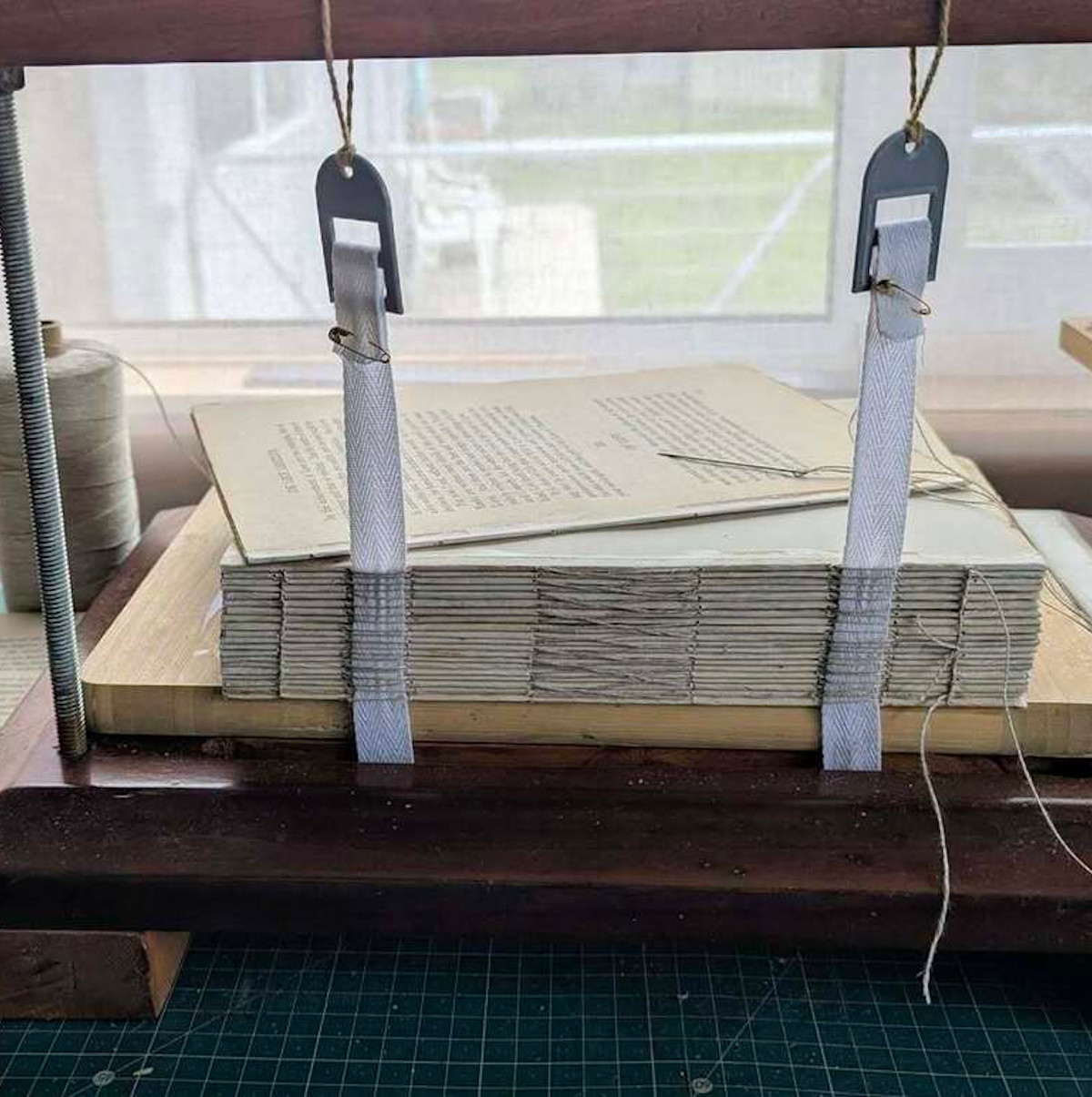 The sections are brought back into alignment. Thread passes through paper in a rhythm that has remained unchanged for centuries.